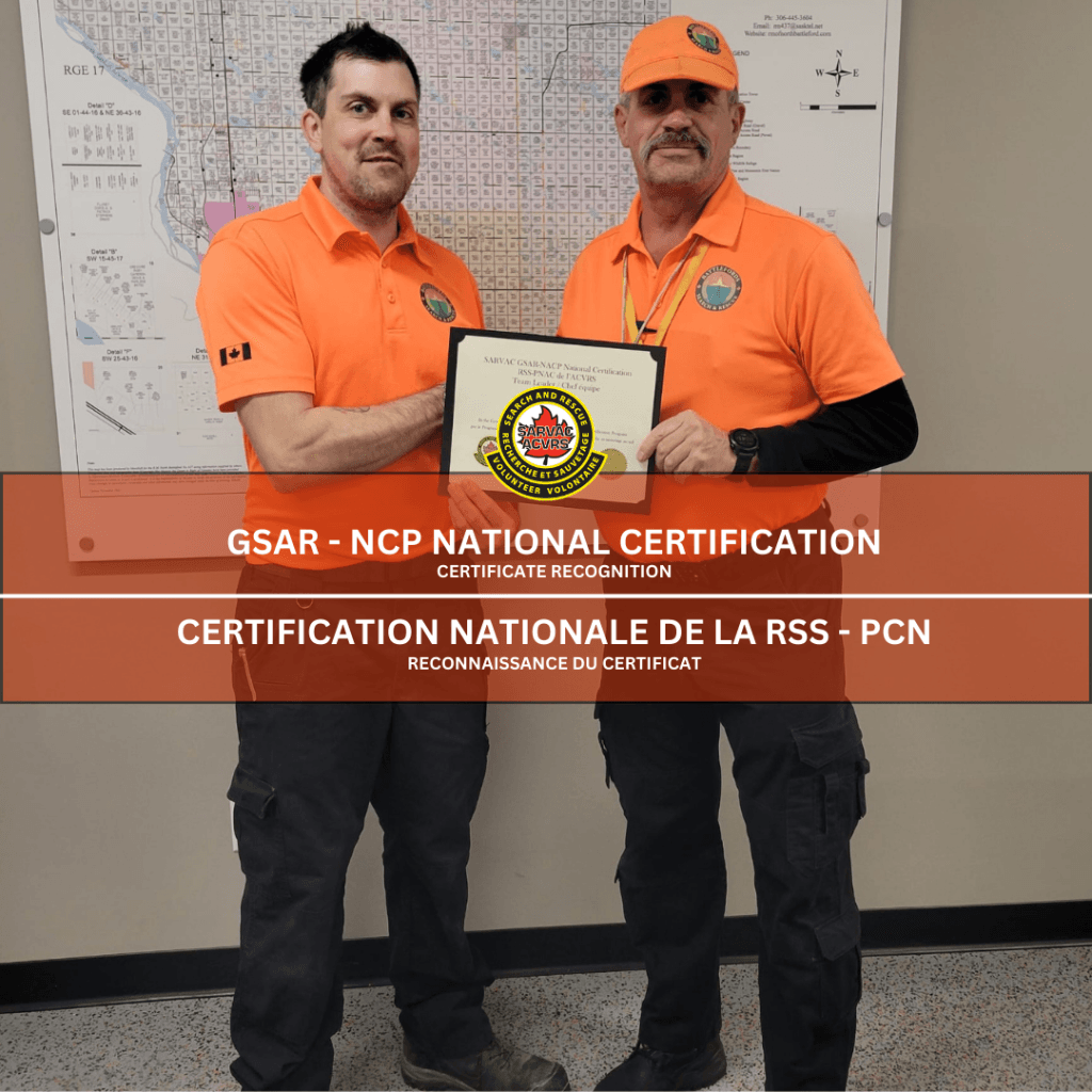 Félicitations à Patrick Reid, de Battlefords Search and Rescue, pour sa réussite en tant que chef d’équipe certifié dans le cadre du programme pilote de certification nationale en recherche et sauvetage au sol (GSAR-NCP).